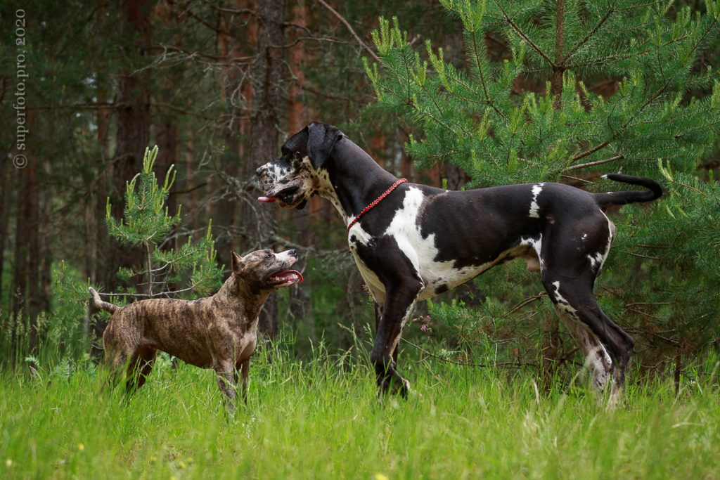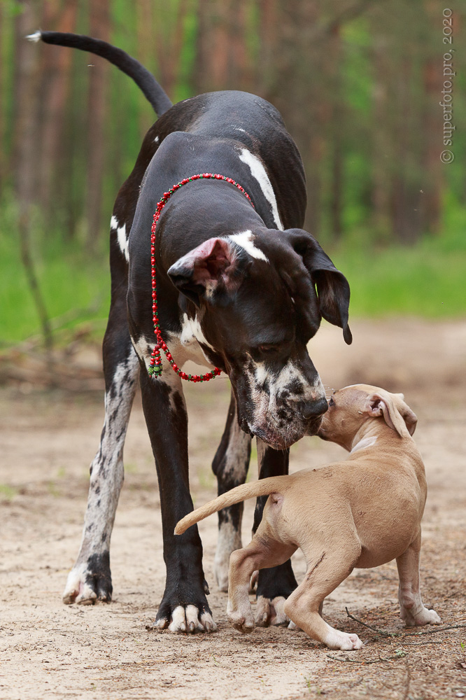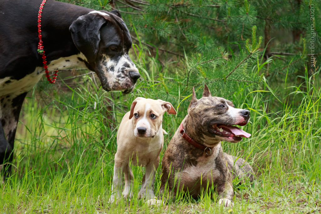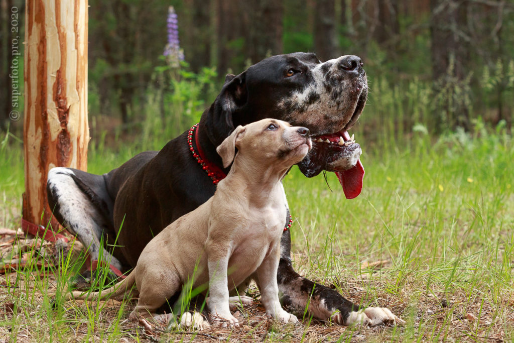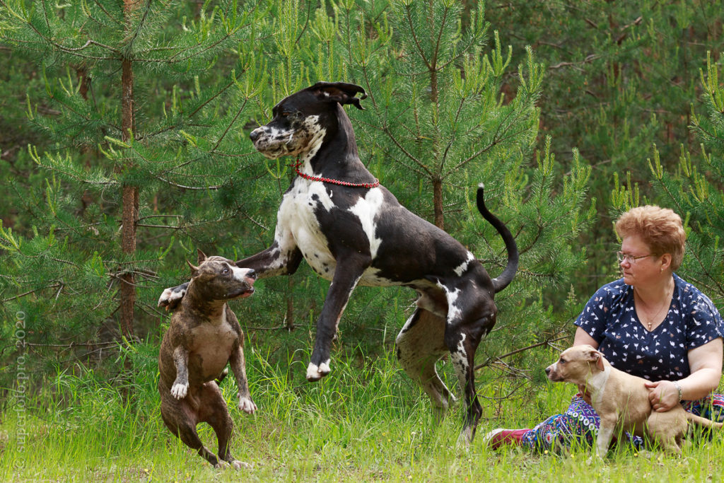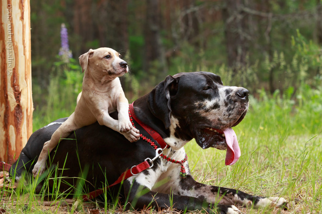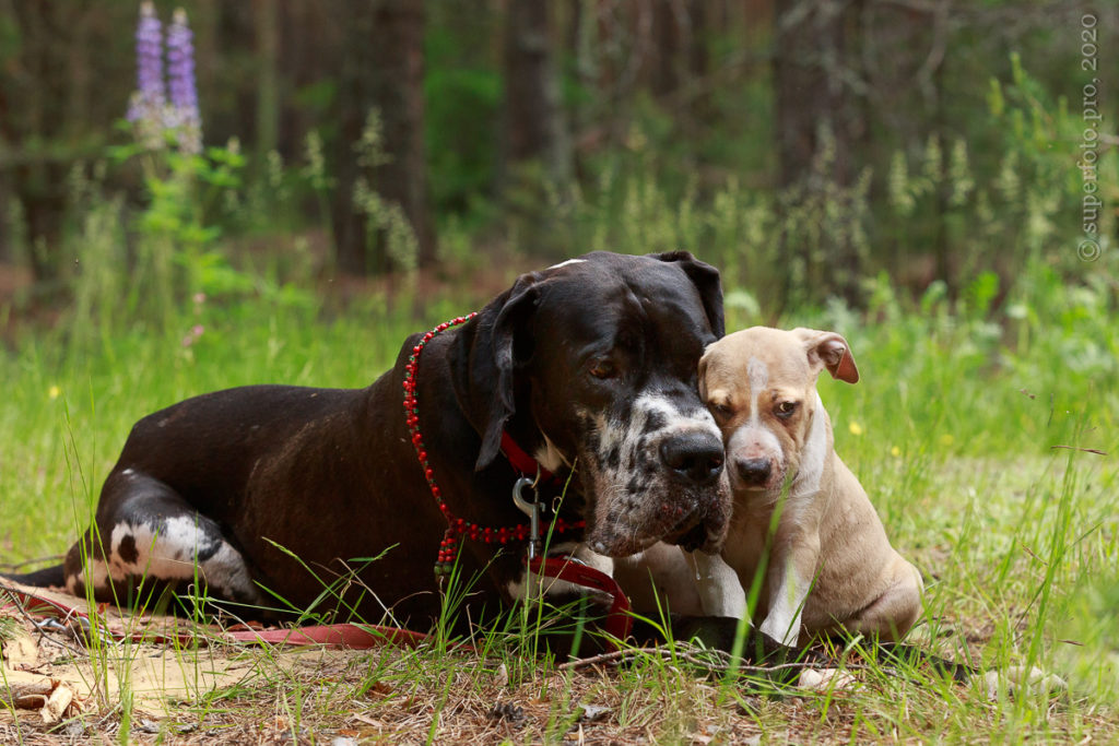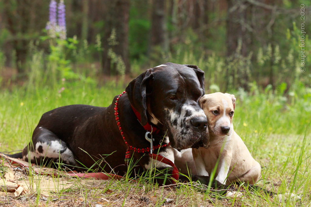 В съёмке в качестве ассистентов принимали участие мой немецкий дог Бест оф Ройс Норд (Стёпа) и амстаффка заводчицы щенка Tcenniy Prize Empress (Эми).