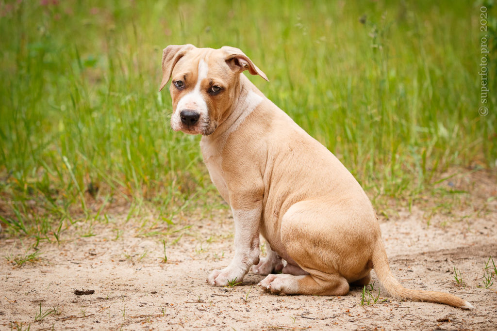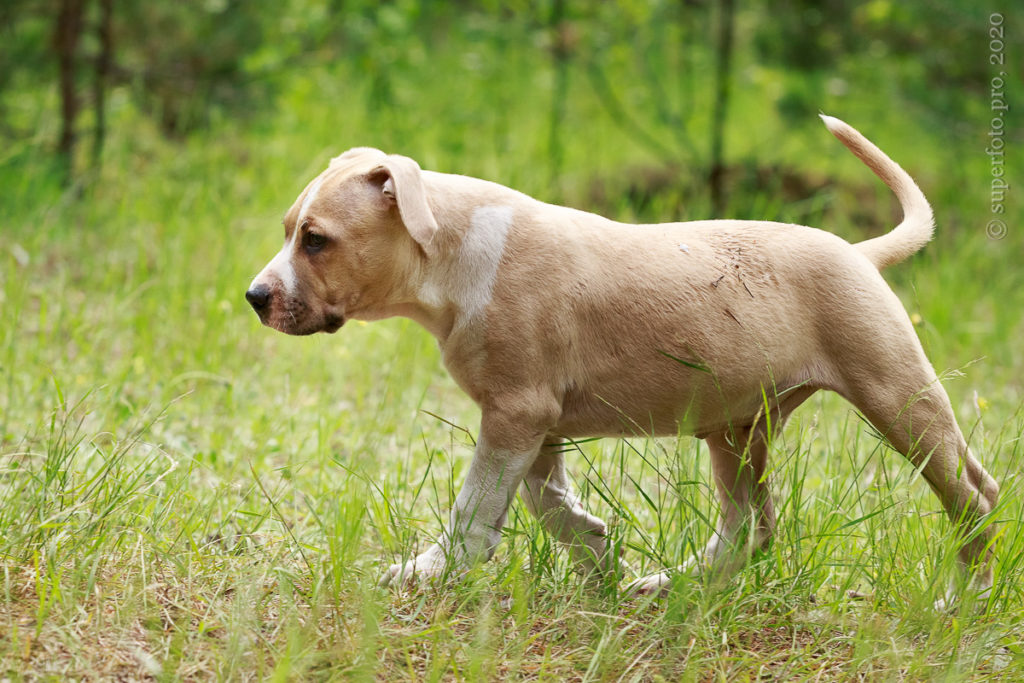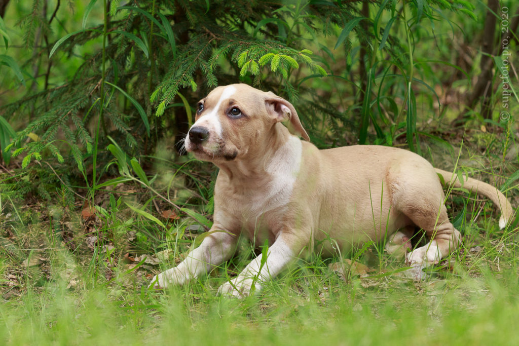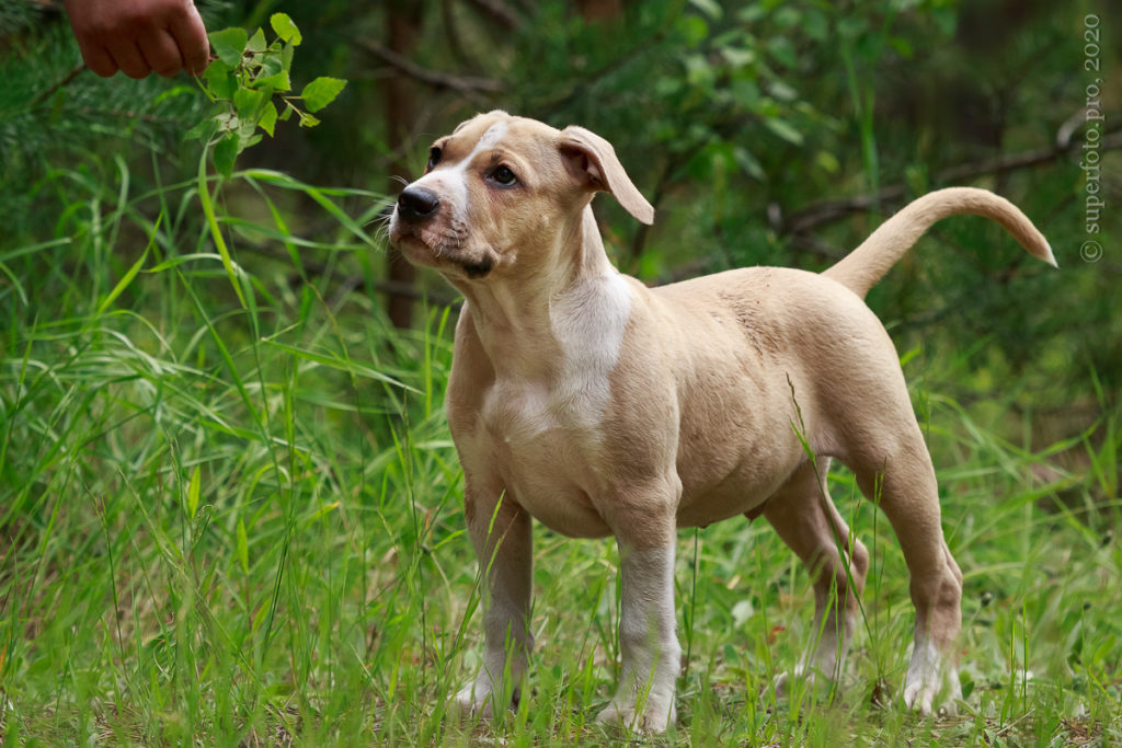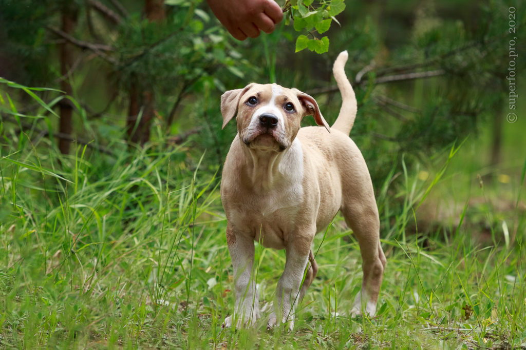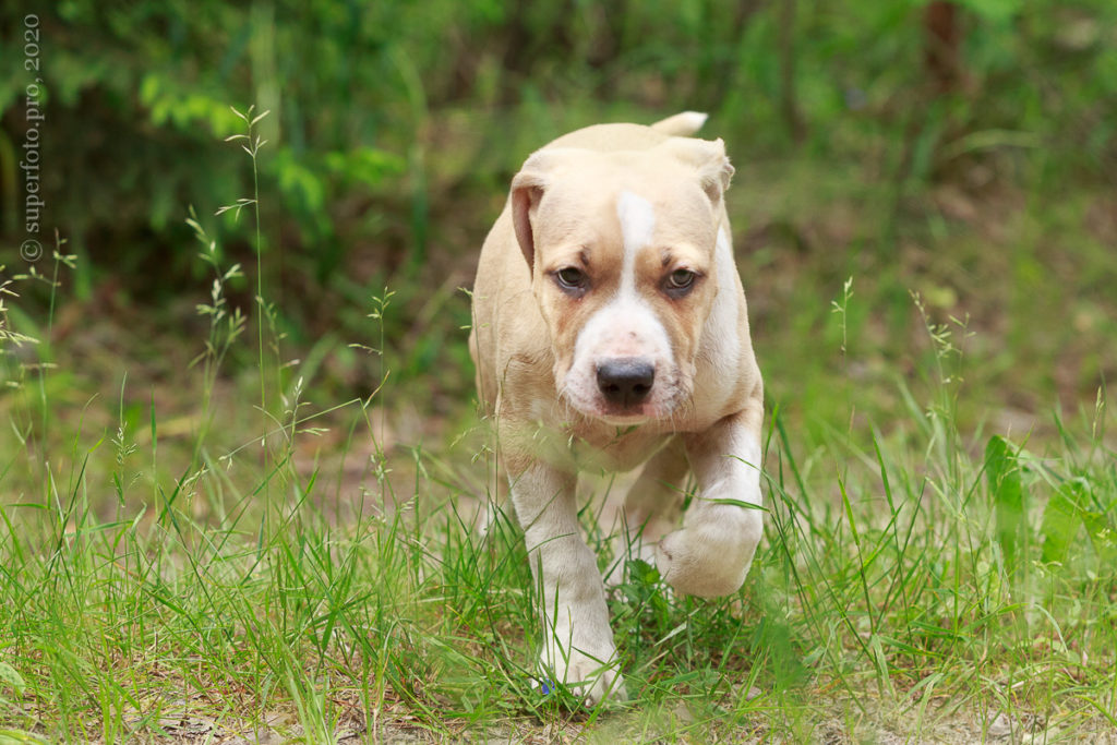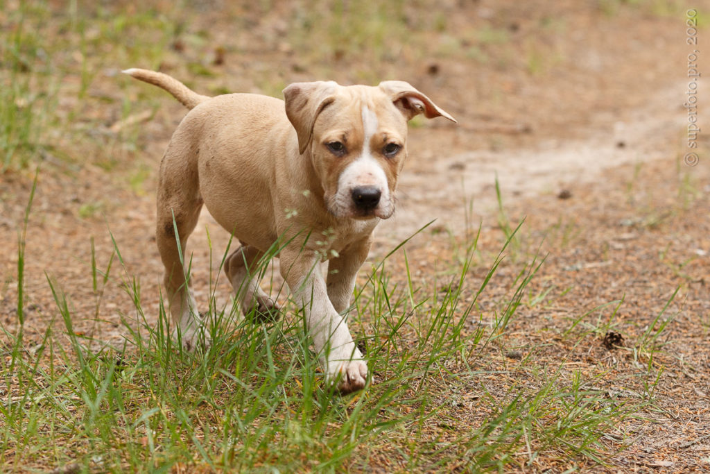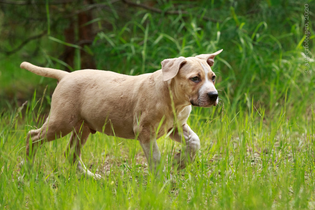 Фотосъёмка подрощенного щенка амстаффа для продажи. Съёмка в формате прогулки по лесу.