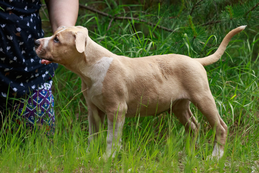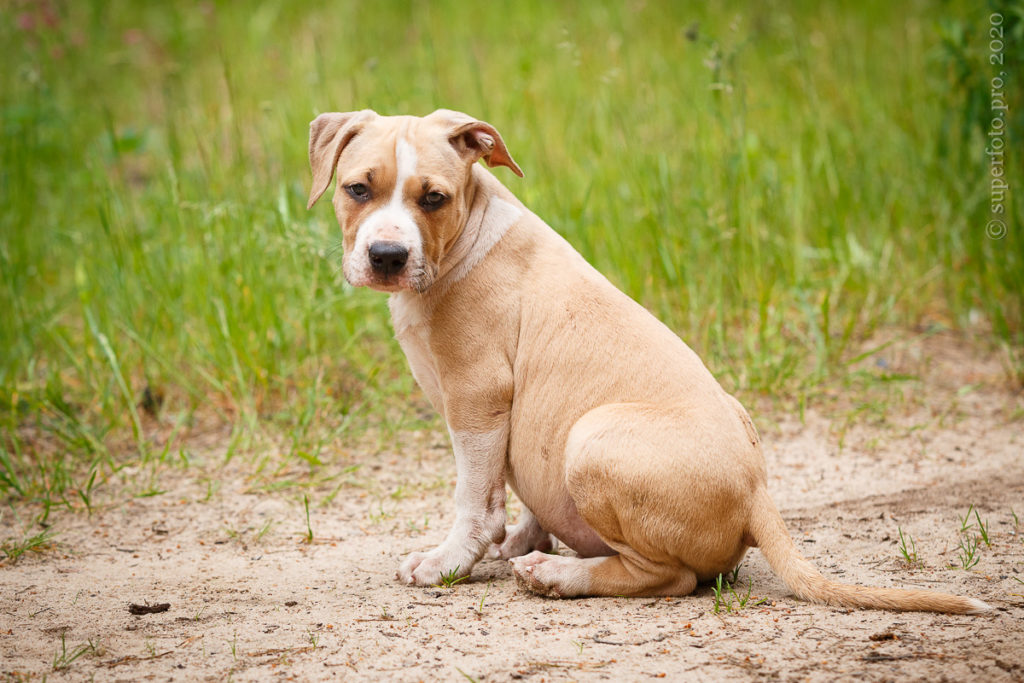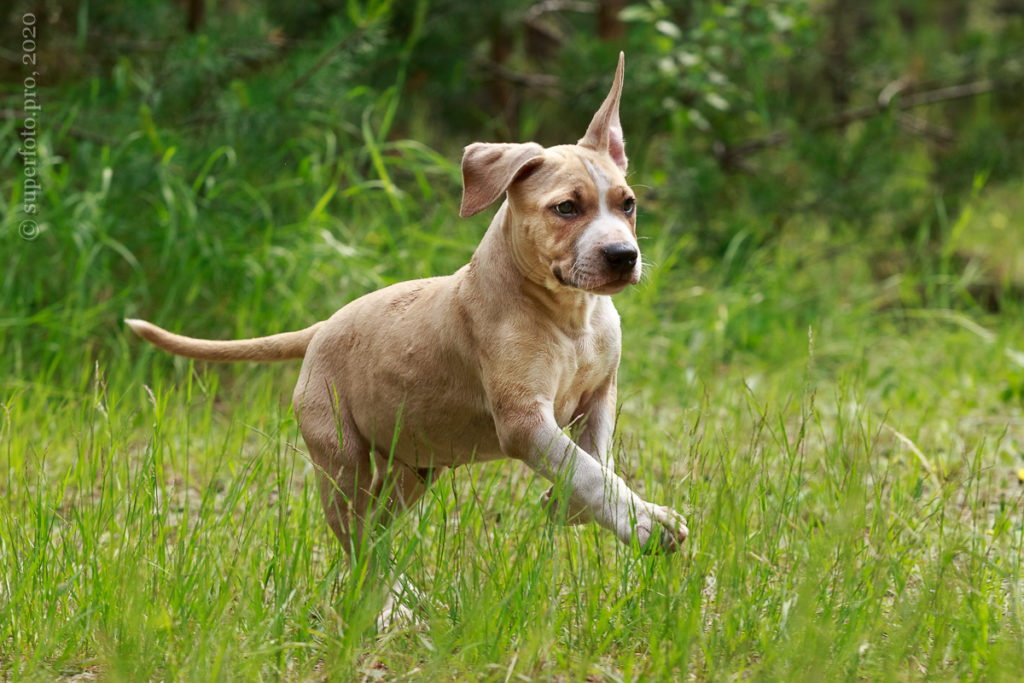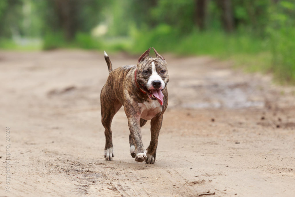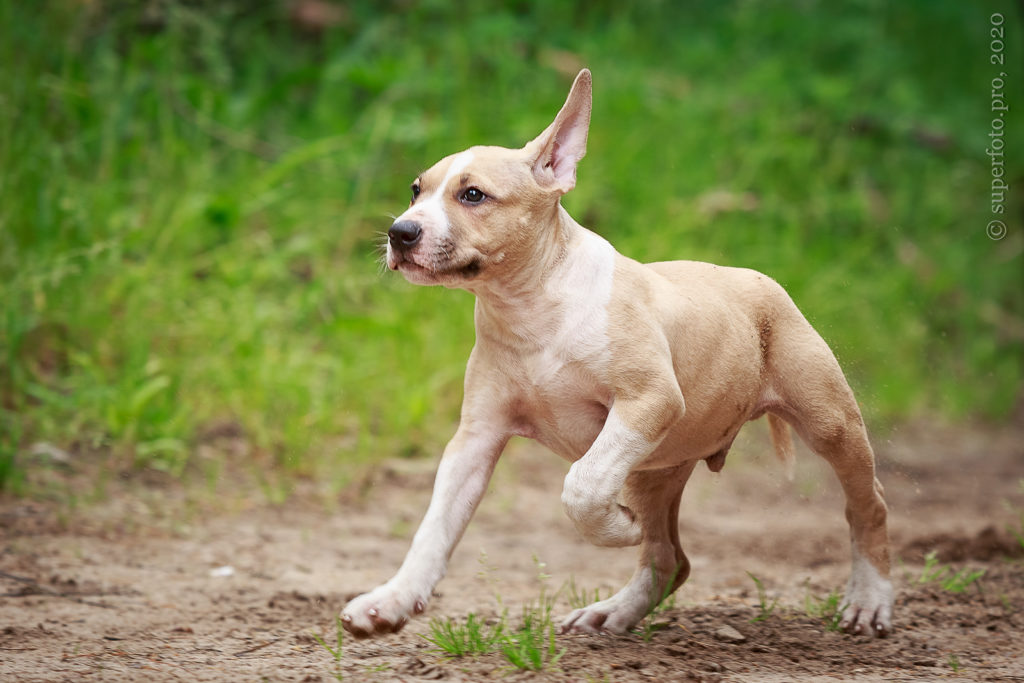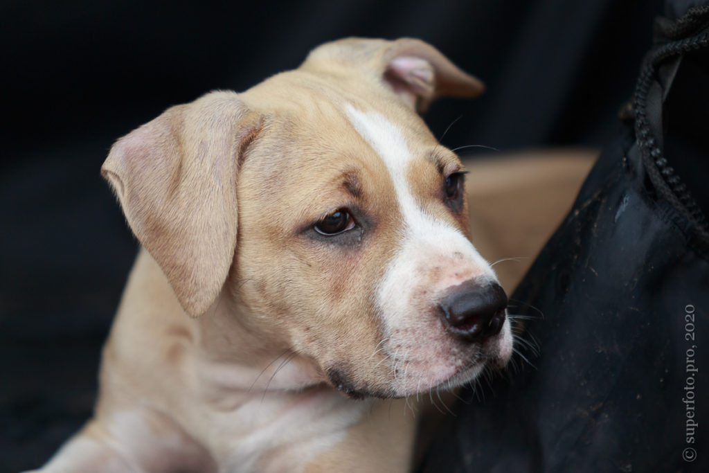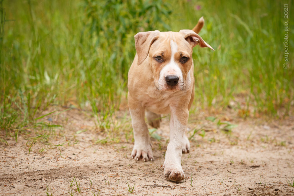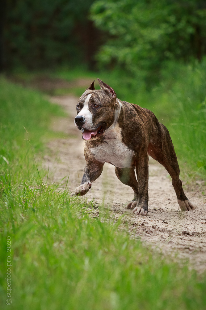 Фотосъёмка подрощенного щенка амстаффа для продажи. Съёмка в формате прогулки по лесу.