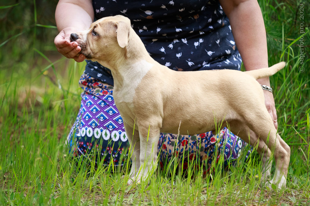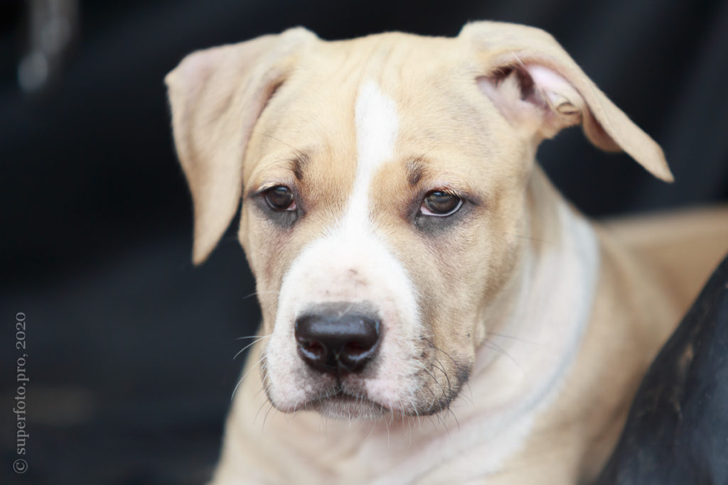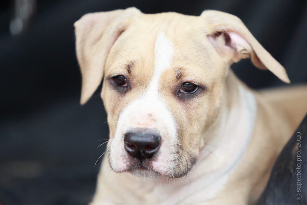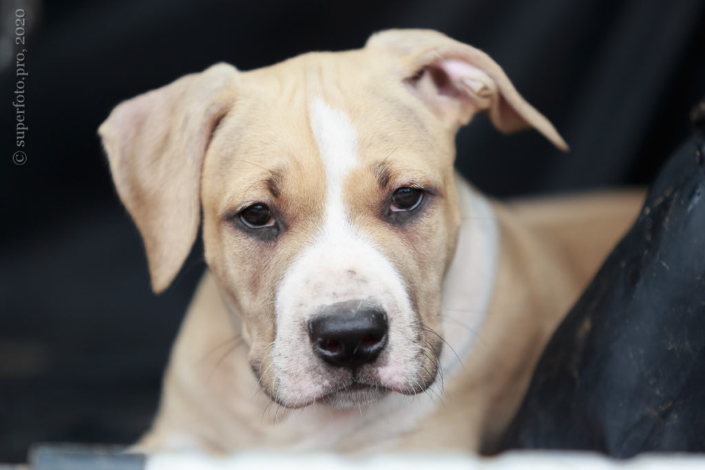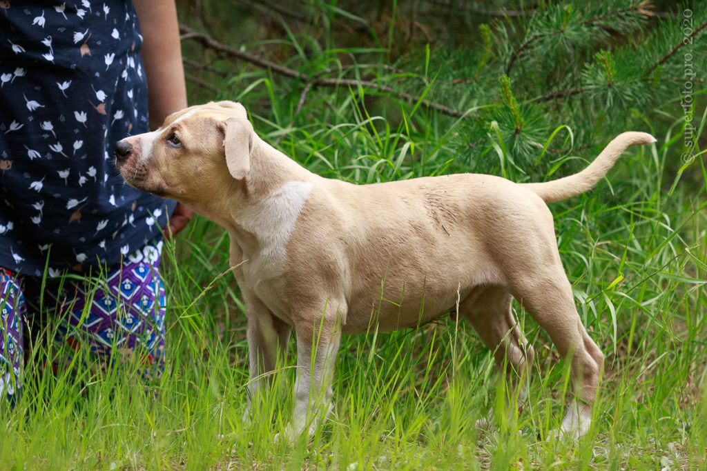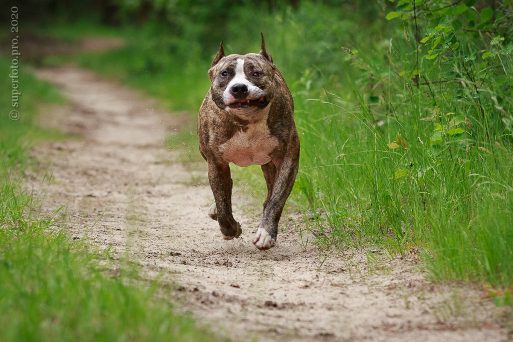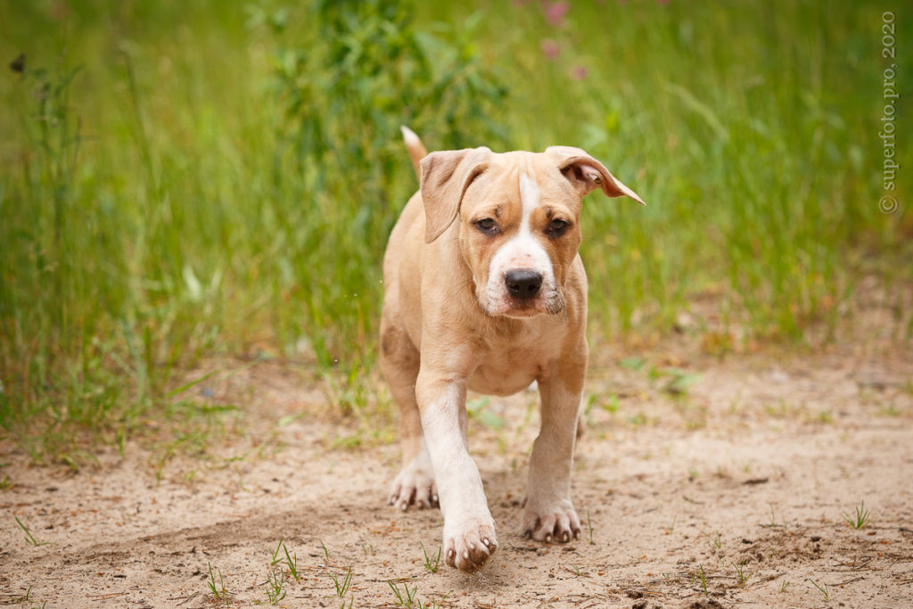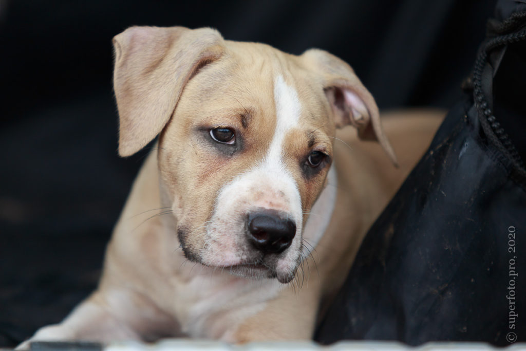 Фотосъёмка подрощенного щенка амстаффа для продажи. Съёмка в формате прогулки по лесу.