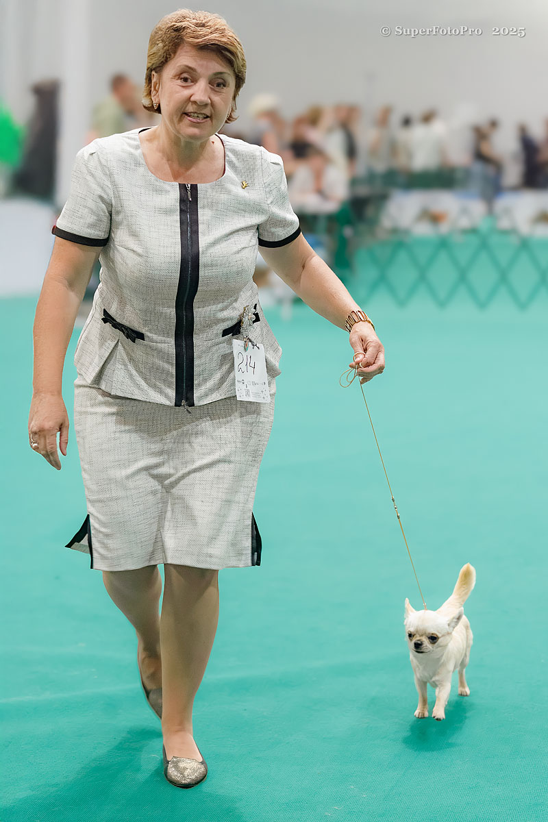 Чихуахуа с владельцем. Фото с выставки собак «Летний Кубок Москвы», прошедшей 02.08.2025 в «Крокус-Экспо» (Москва)